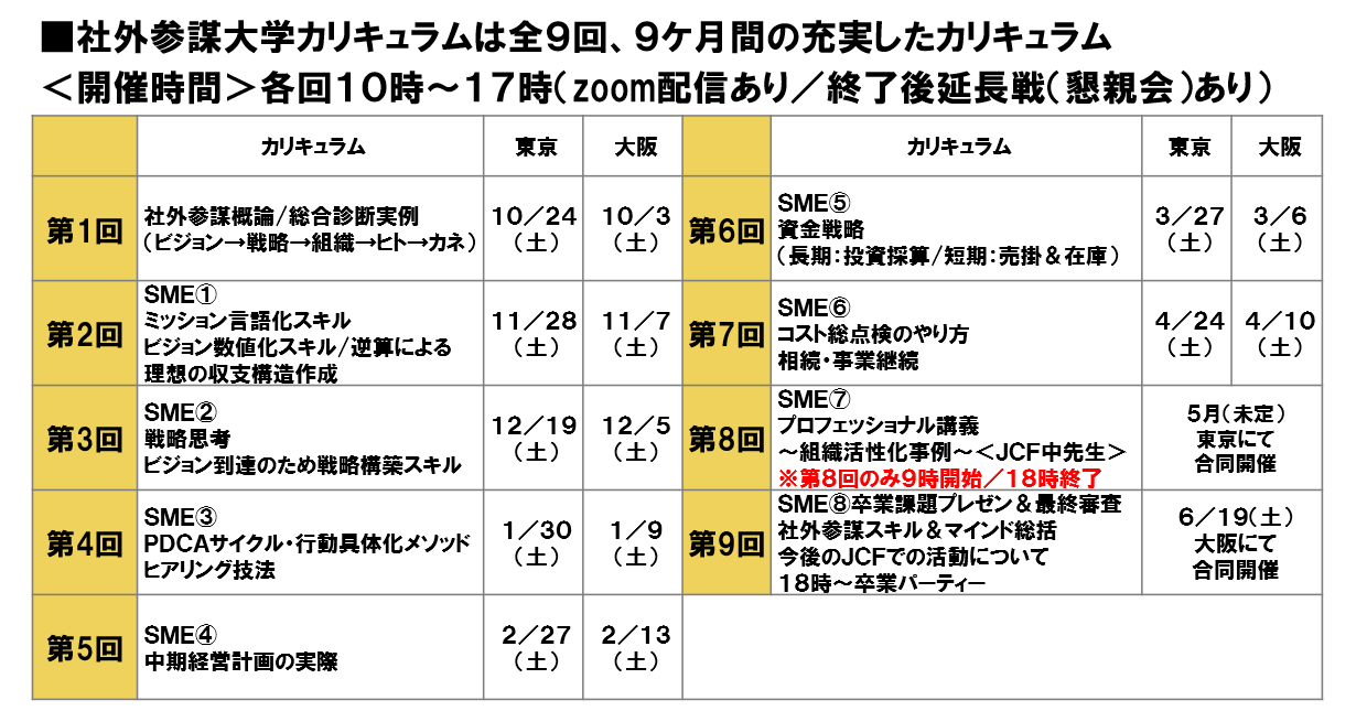 | 内容 | ◎全講義受講料、課題添削、資料代 ◎受講期間中の相談無制限 ◎講義で紹介するコンサルツールの利用権 ◎個別のクライアント案件の相談(受講期間中適宜) ◎受講生限定のグループページへの招待 ◎卒業後、認定社外参謀になれる権利 |